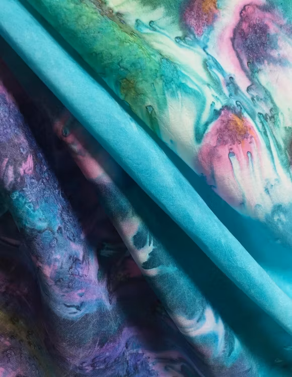 Två scarfs i en genom den tvådelade färgsättningen. Ena halvan i mörkare turkosblått med stort flammande lila/cerise/violetta löv. Motsatta halvan i ljusare turkos med fantasiblomma i grönturkost, omgiven av flytande blomster i cerise och violetta nyanser.