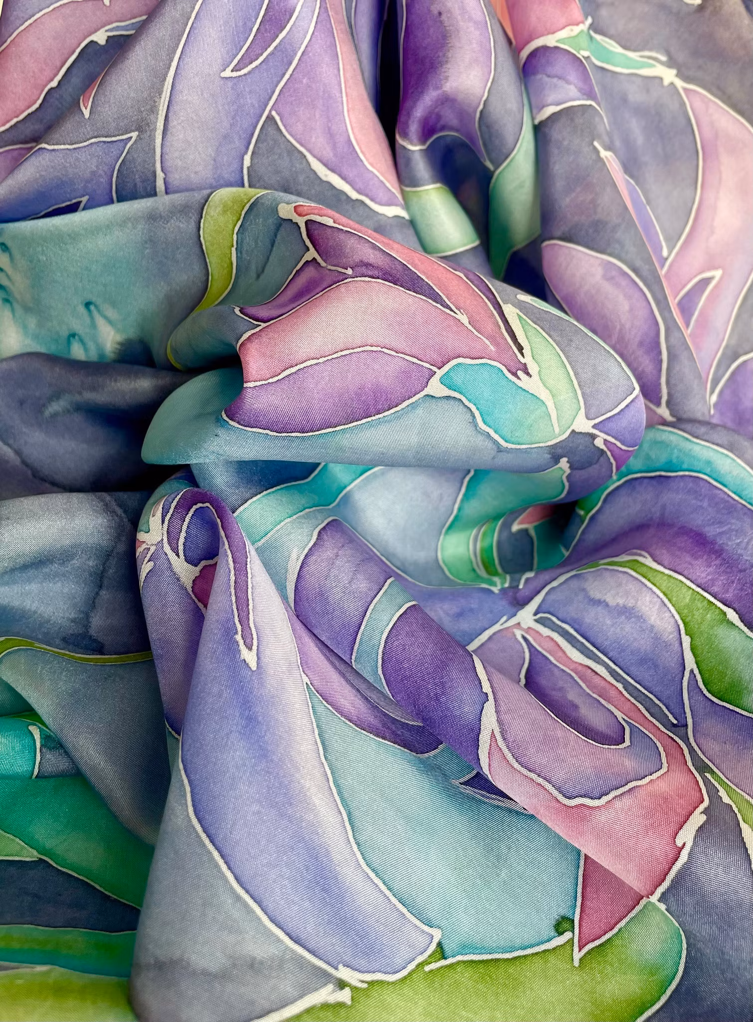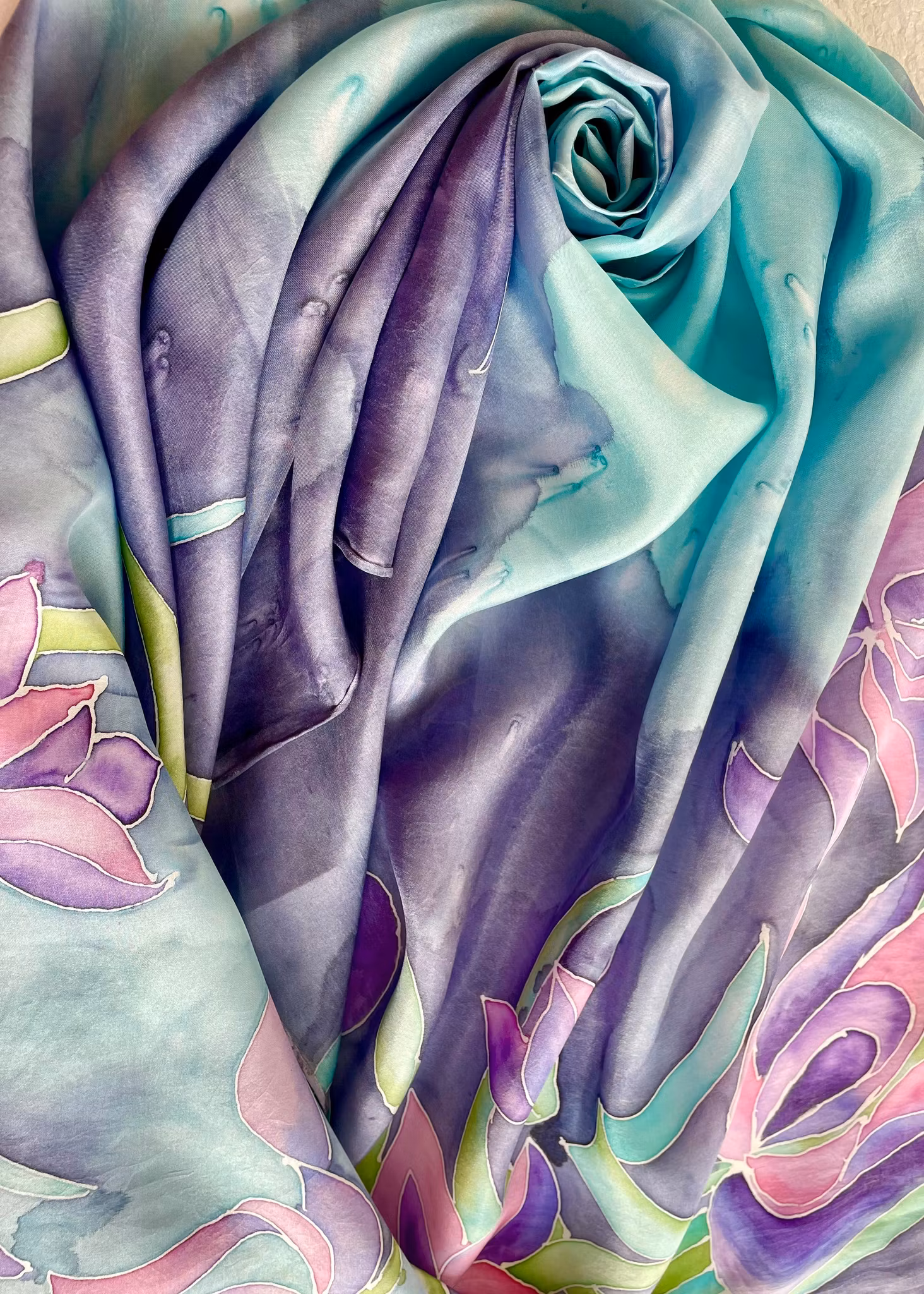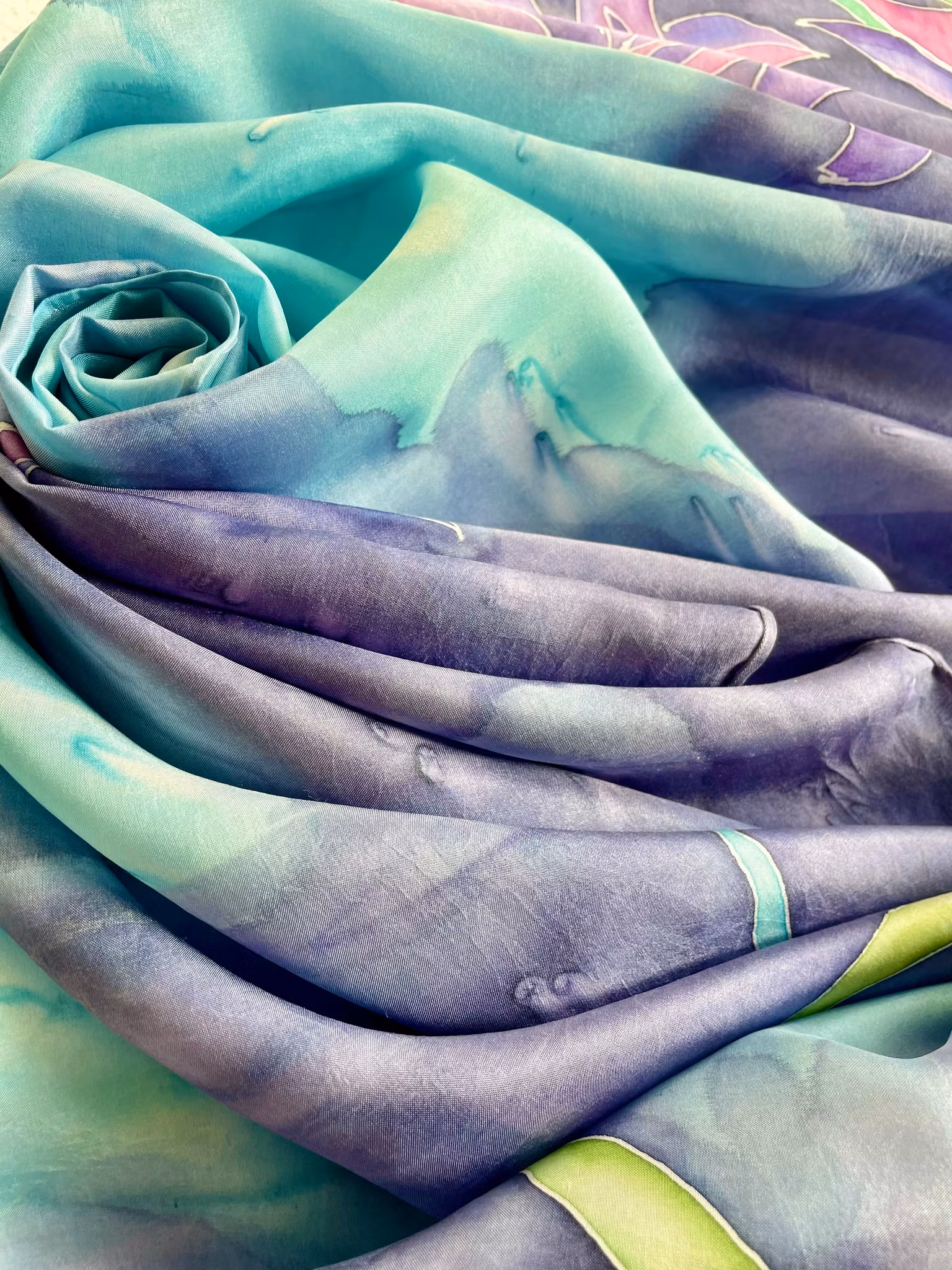 I lager. Antal: 1 329 - Go whit the flow 950 kr Lägg i korgen Artikelnummer: 329 Leverantör: Harmoniskt flow i turkosgröna och lila/rosalila nyanser. Skir och sval men skönt och behagligt värmande då du sveper den om dig. 50x180 cm32 g