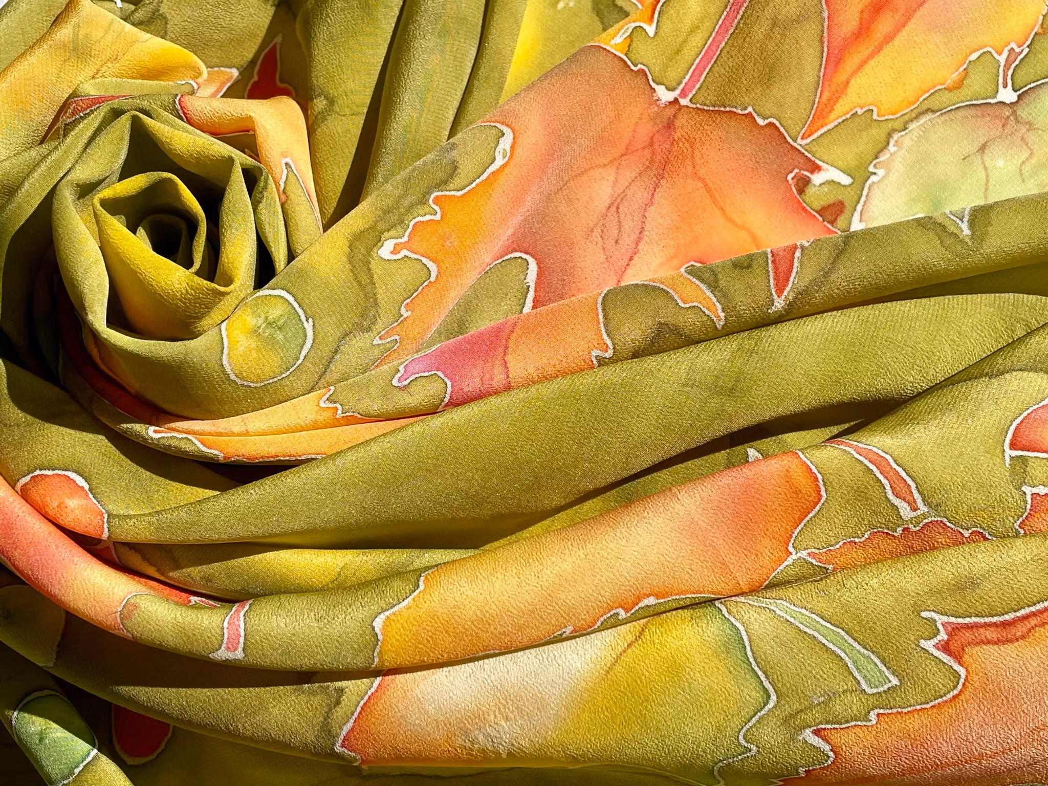 336 - Shapes of Autumn 1 050 kr Produkten är tyvärr slut i lager. :( Artikelnummer: 336 Leverantör: Konturer av en höstdag med singlande löv i lysande färger mot en skog i mossgröna och olivfärgade nyanser.50x180cmCrêpe de Chine