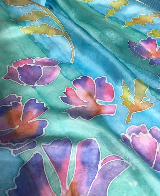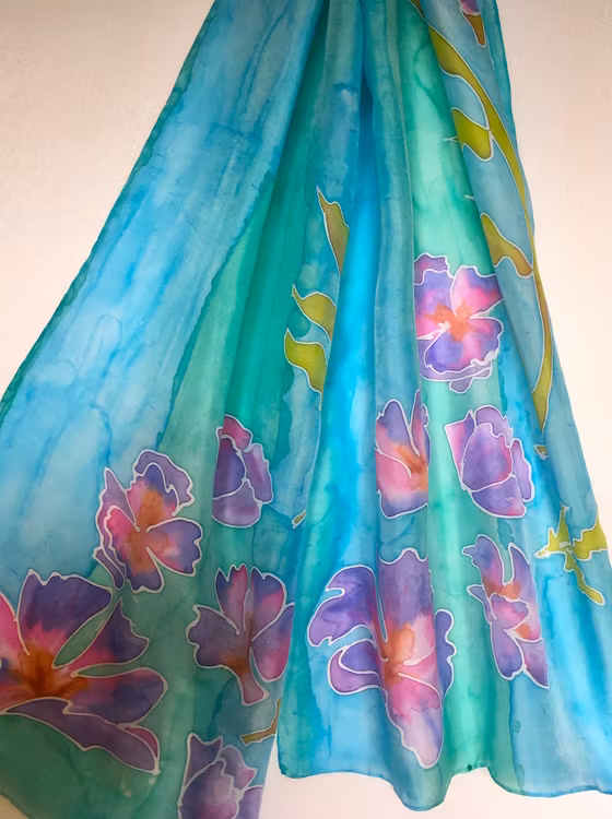 I lager. Antal: 1 227 - Dreamy Shoreline 950 kr Lägg i korgen Artikelnummer: 227 Leverantör: Böljande vattenlinje i turkosgröna och blå toner flödar längs sjalens mitt. I kortändorna strandväxter i nyanser av lavendel med rosa och cognacsfärgade inslag.45x180 cm32g