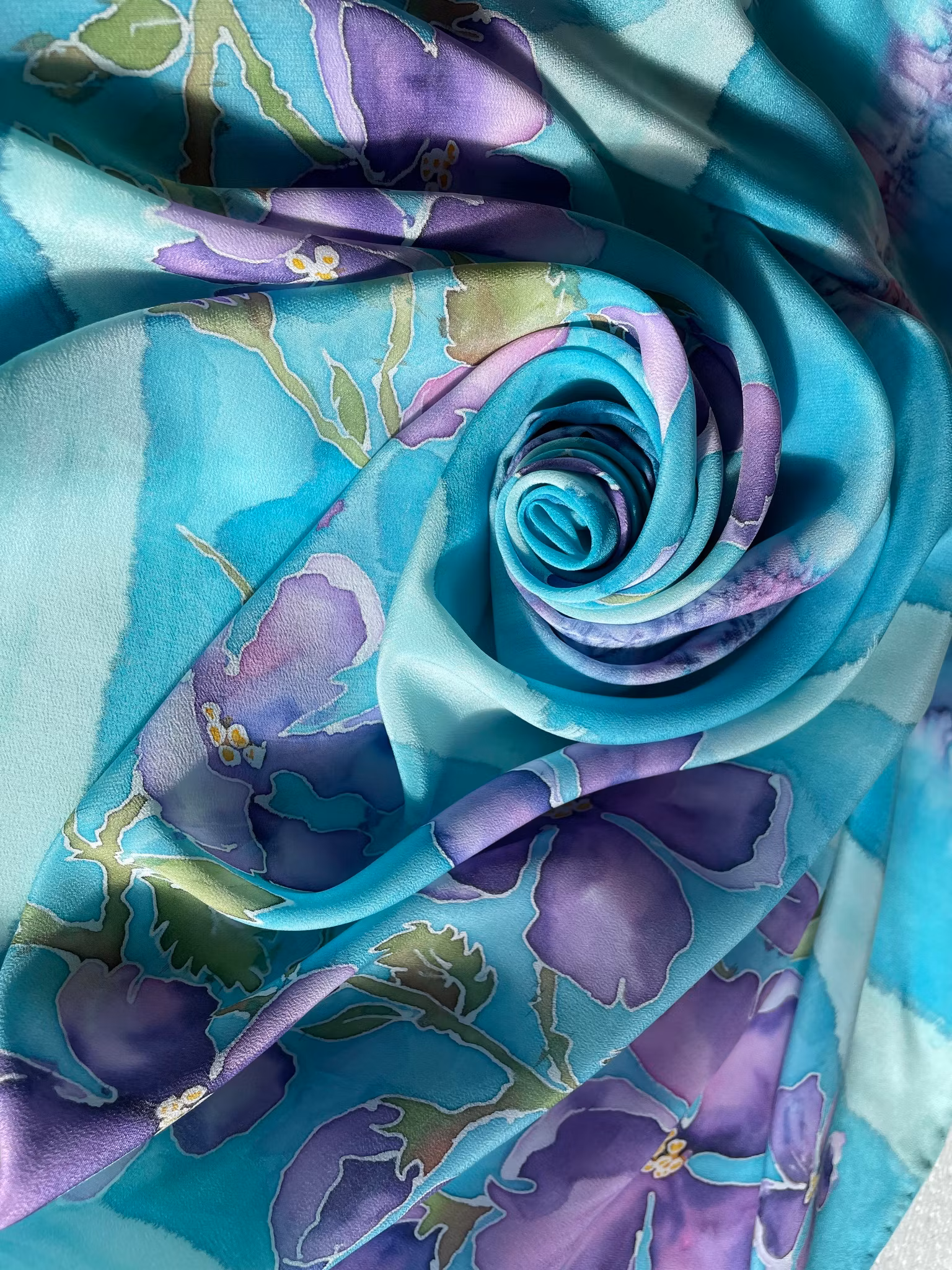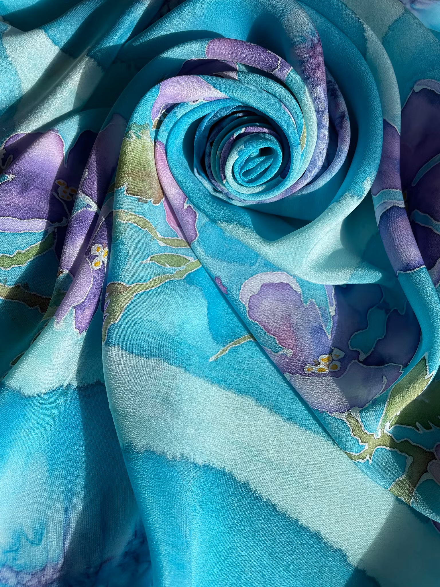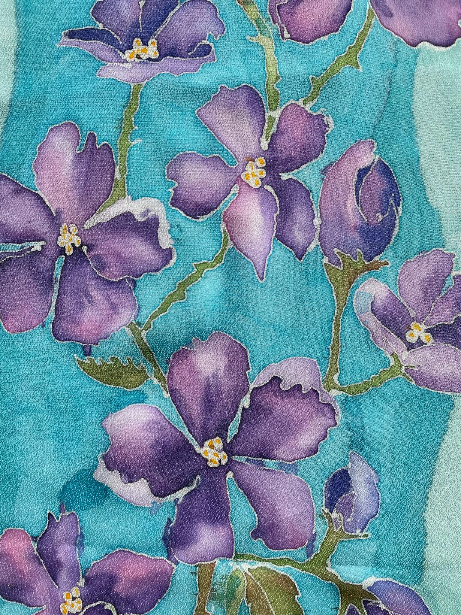 Blommor är onekligen en inspirationskälla men jag föredrar att se dem som just inspiration inte objekt för ren avbildning. Här lite busiga fantasiblommor i lila/syren toner mot en bakgrund av turkosa nyanser. Ljust, fräscht och lättburet.