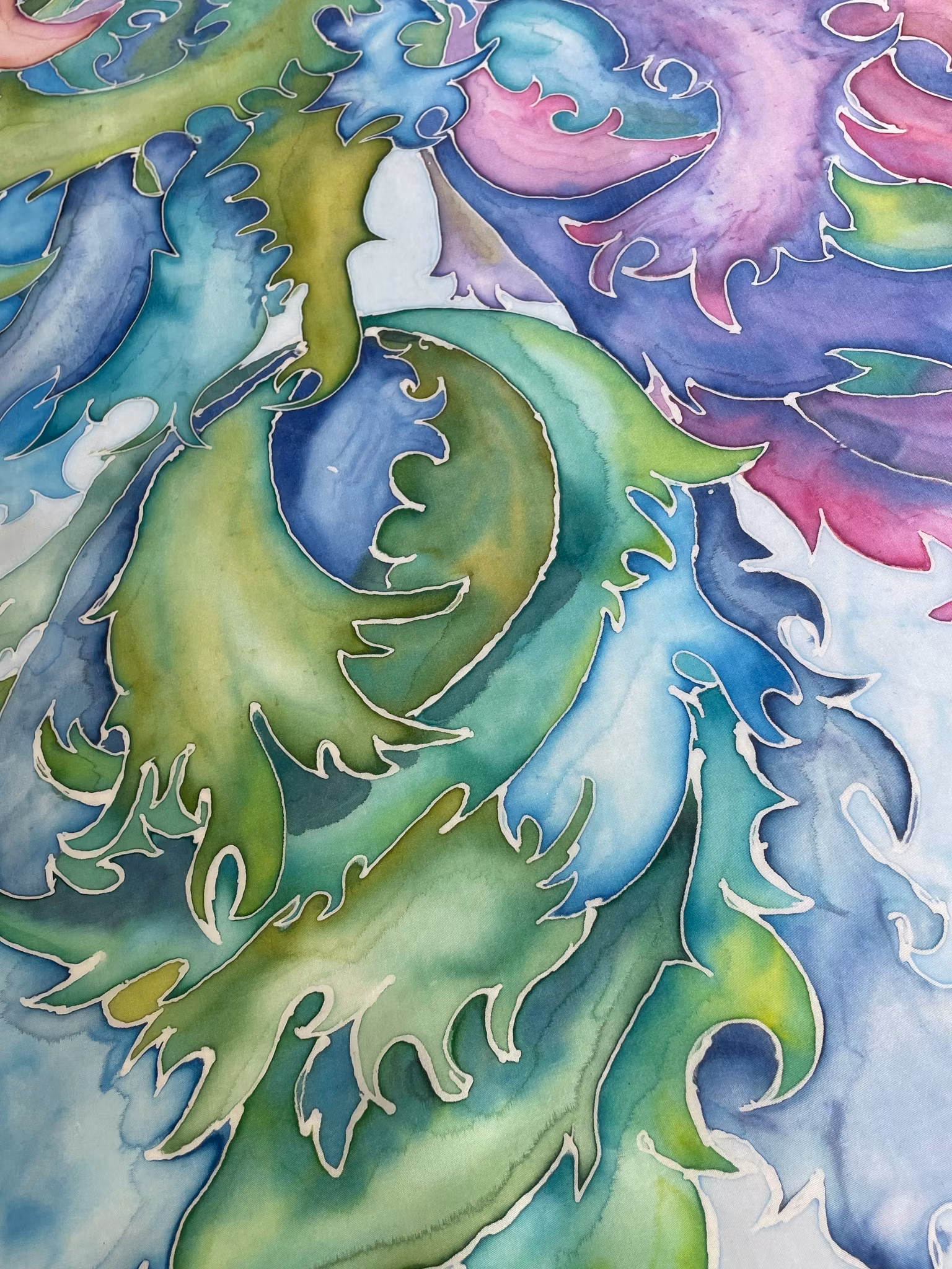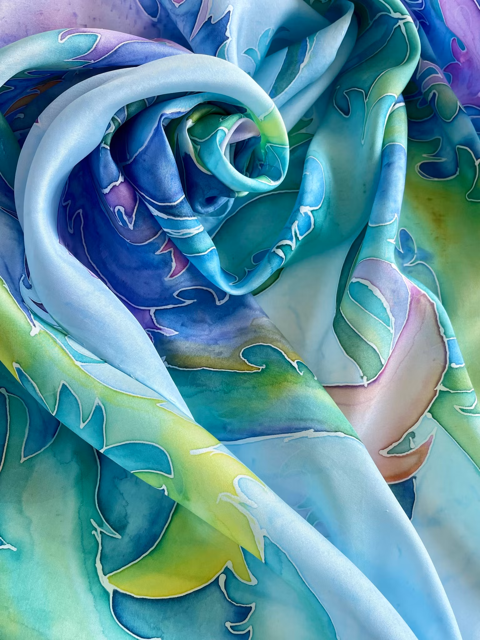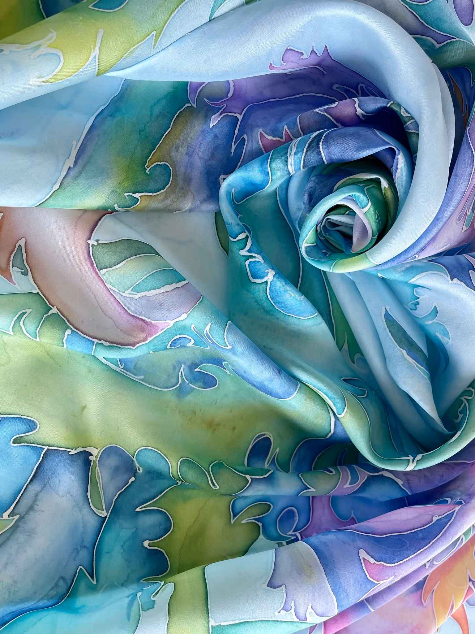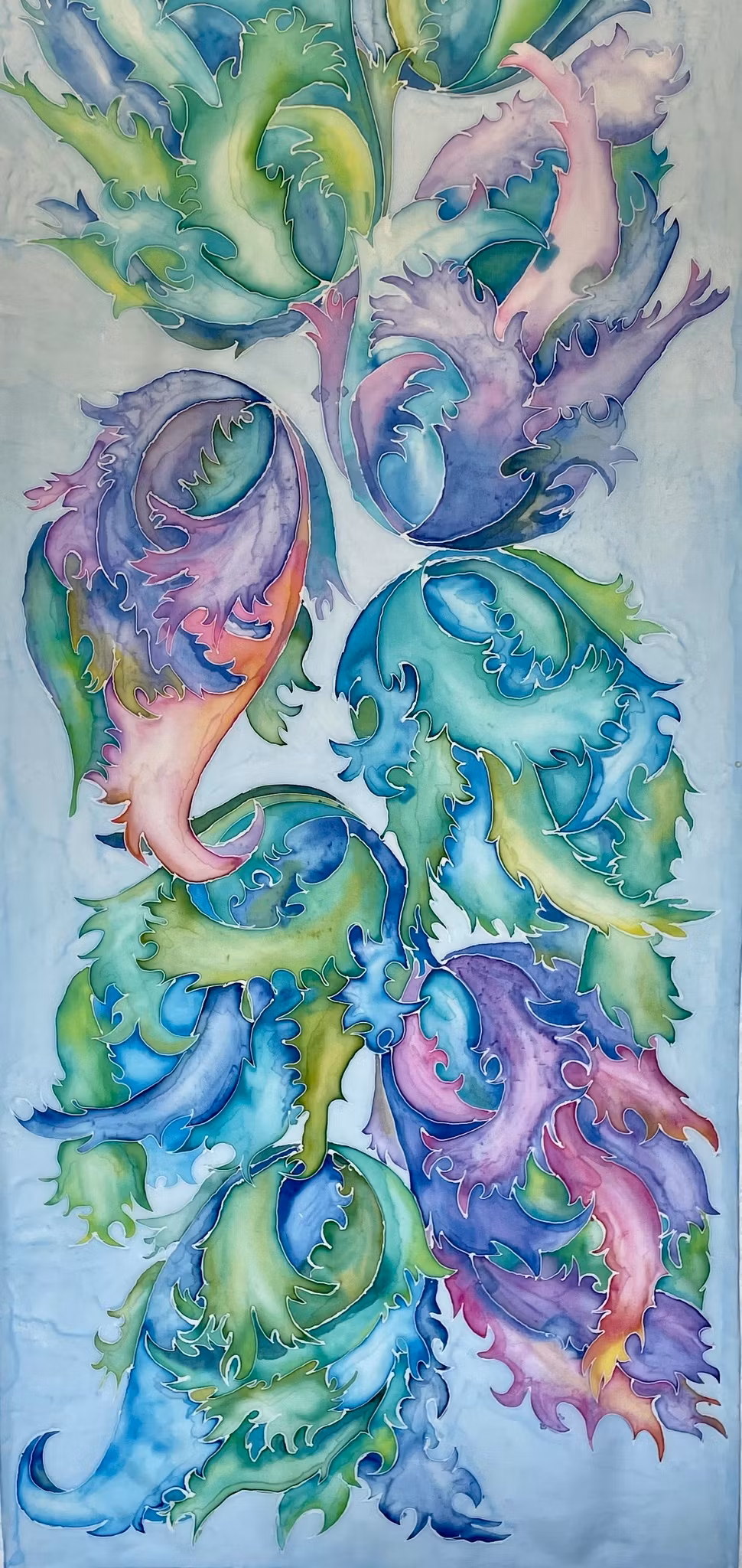 334 - Wild and Free 950 kr Produkten är tyvärr slut i lager. :( Artikelnummer: 334 Leverantör: De växer vilt, de växer fritt, de växer färgstarkt längs hela långsjalens längd.I turkos/grön/aqua och rosa/lila/lavendel nyanser mot en ljust isblå bakgrund.50x180 cm32g
