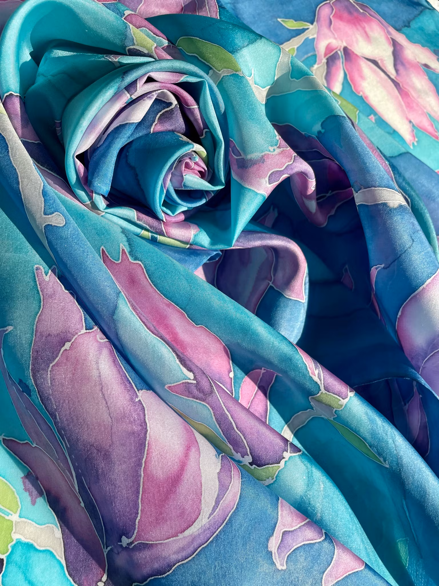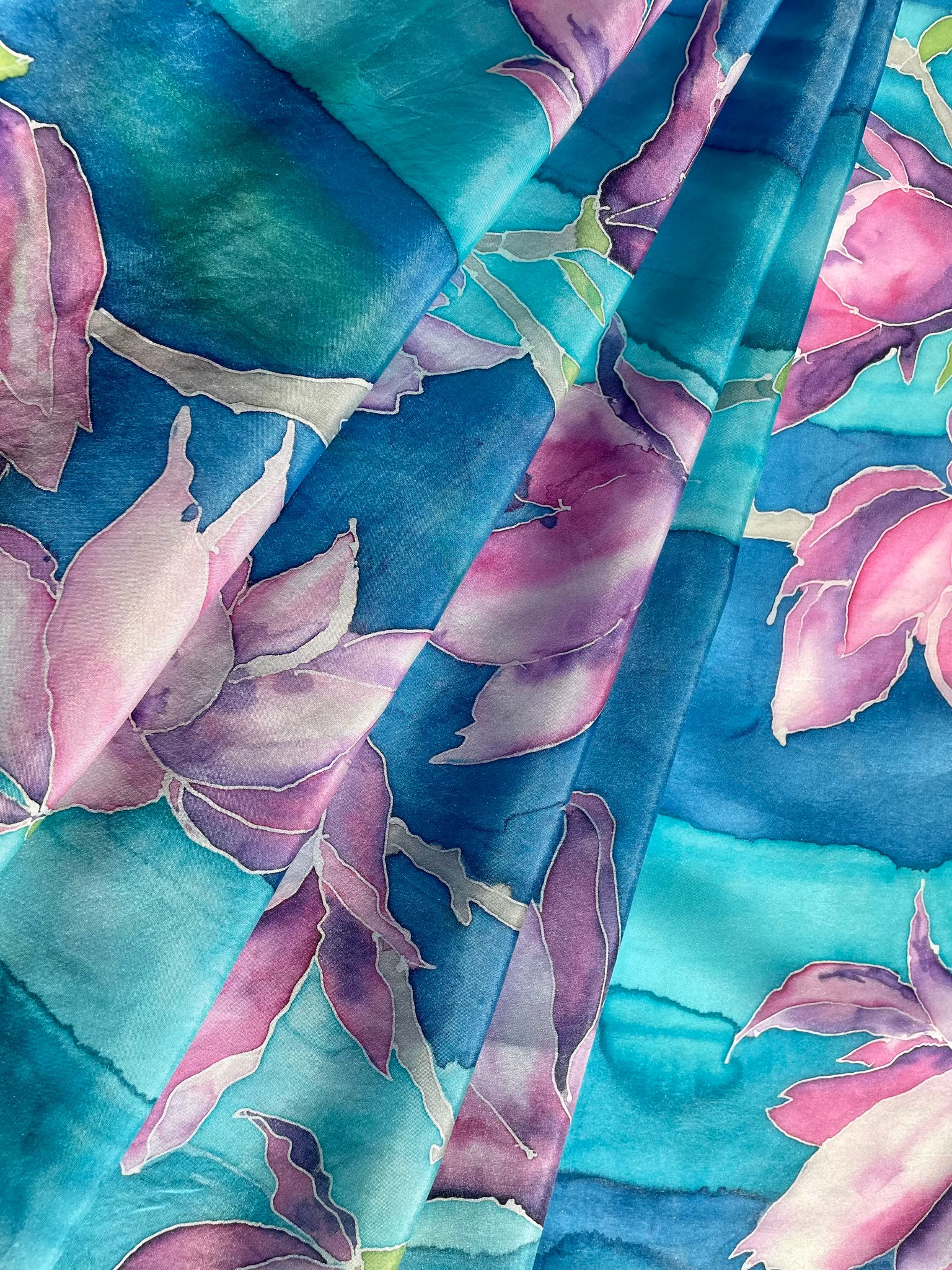 I lager. Antal: 1 335 - Something Special 950 kr Lägg i korgen Artikelnummer: 335 Leverantör: Egensinniga magnolior i rosalila toner bryter sin väg genom turkos/turkosgröna flöden i färgstark harmoni.50x180 cm32g
