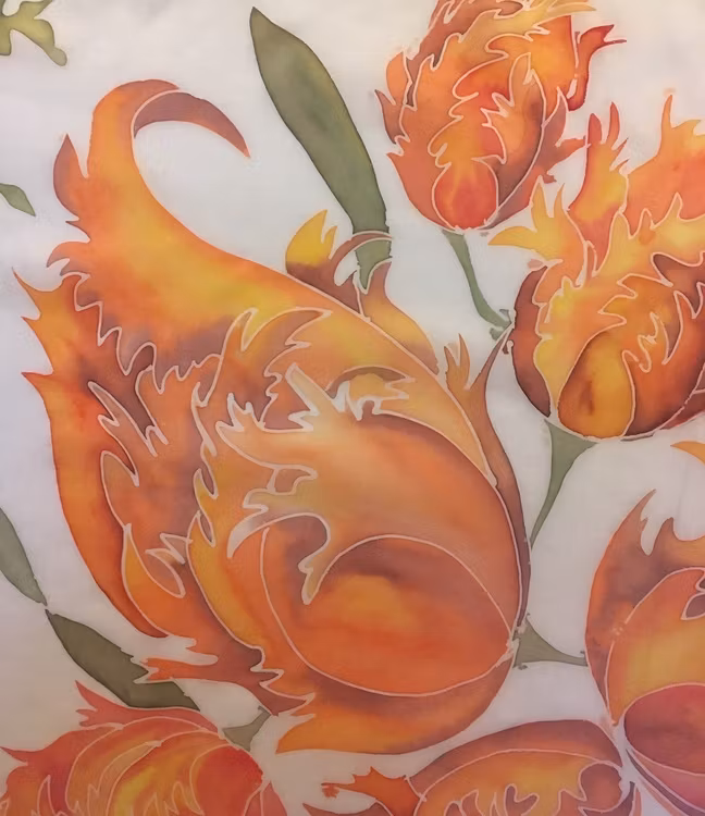 I lager. Antal: 1 265 - Bittersweet Melody 750 kr Lägg i korgen Artikelnummer: 265 Leverantör: Charmigt lättsinnigt spretiga papegojtulpaner i mustiga, varma färger på naturvit botten, omgivna av olivgröna blad.75x75 cm22g